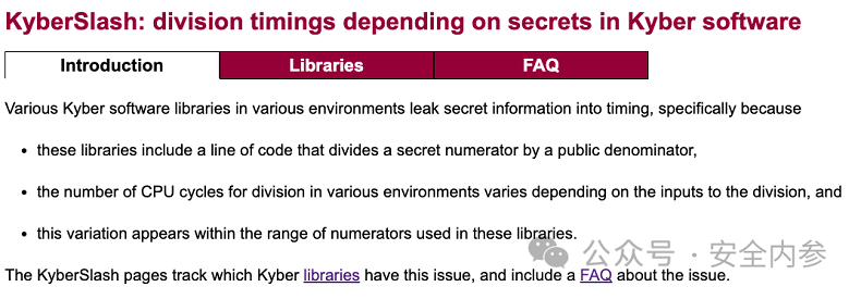 KyberSlash缺陷攻击是基于时间的攻击。攻击者利用Kyber在解封装过程中某些除法操作的执行方式,从而分析执行时间并推导可能损害加密的密钥。