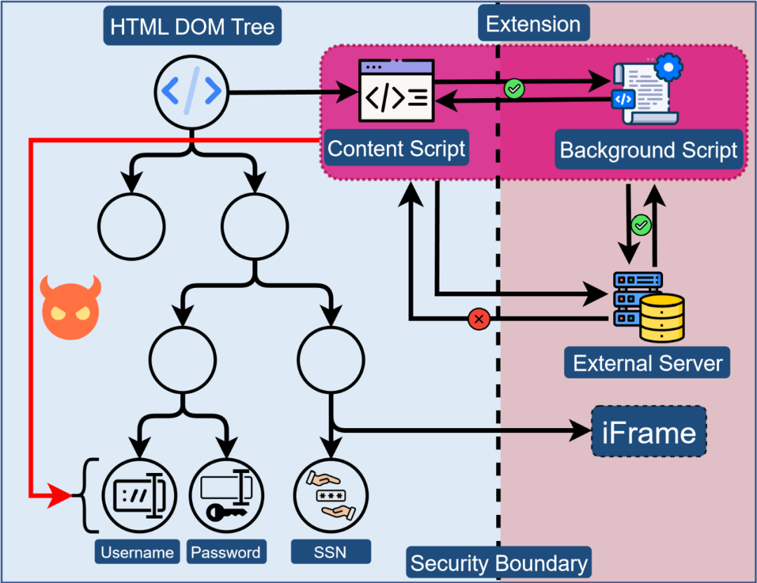 该研究团队表示,由于浏览器的粗粒度权限模型,扩展和网页之间缺乏安全边界。这种边界的缺乏允许扩展自由地与HTML元素交互并操作HTML元素,包括HTML输入元素。具体来说,他们发现扩展权限模型违反了两个安全原则:①最小权限;②完全中介。——而这会允许恶意扩展在用户不知情的情况下访问用户敏感信息。