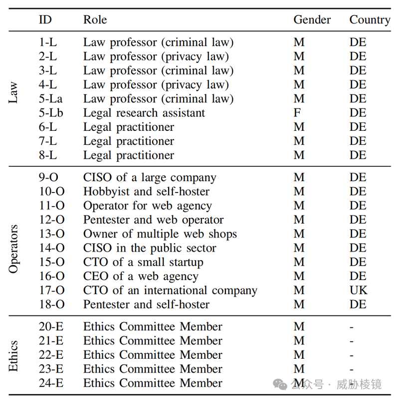 23 次访谈的受访者情况如下所示,其中包括 9 名法律专家、10 名网站运营方、5 名伦理委员会成员。研究人员已经努力进行多元化拓展,Twitter 和 LinkedIn 上的广告分别展现了 4 万次与 2 千次。