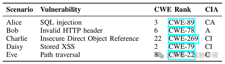 小例子如“Alice 检查 Web 服务器是否存在 SQL 注入,通过类似 sleep 函数来延迟数据库相应,判断该服务器是否存在漏洞”,“Bob 向 Web 服务器发送的非标准 HTTP 请求会导致网站崩溃,且只能由 IT 部门重新启动服务器解决”。