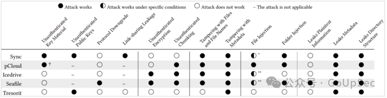 研究人员乔纳斯·霍夫曼(Jonas Hofmann)和权志雄(Kien Tuong Turong)对包括Sync、pCloud、Icedrive、Seafile以及Tresorit在内的五大加密云存储平台进行了详细的安全分析。结果表明,尽管这些服务的营销宣传中承诺“数据绝对安全”,但实际情况并非如此。这些平台中均存在一定的漏洞,允许攻击者通过控制服务器,读取、篡改或注入文件,从而对用户数据进行未授权的访问或篡改。