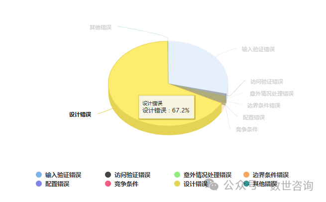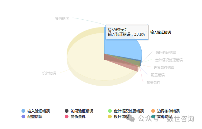 2023年CNVD的漏洞分布显示排名第一的漏洞类型为“设计错误”,占比67.2%,其次为“输入验证错误”,占比28.9%。