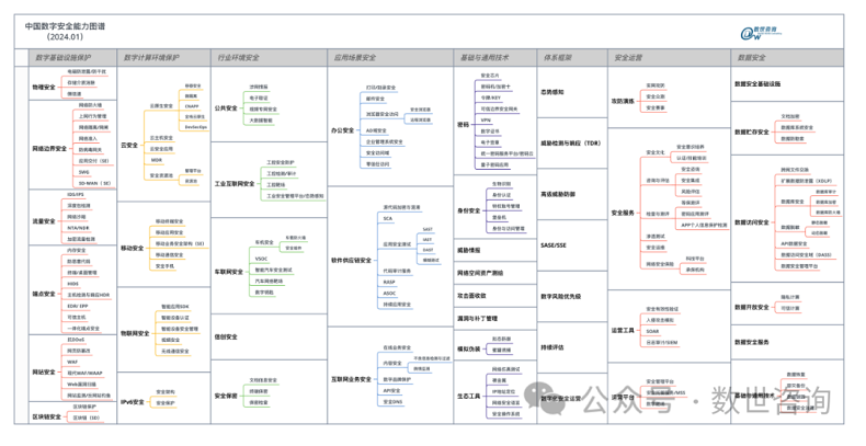 从数字资产、数字活动与安全能力三大元素和位于中心的数据安全共四大维度出发,能力图谱划分出八大方向。每个方向又包含各自一级或子级的细分领域。
