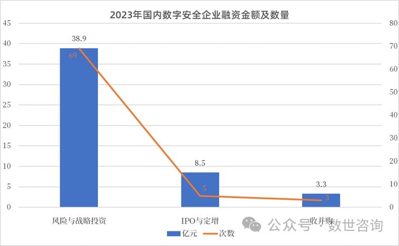 据数世咨询统计,2023年国内数字安全企业股权融资70余笔,与2022年相比下降26%。股权融资总额约39亿元,与2022年相比下降45%。