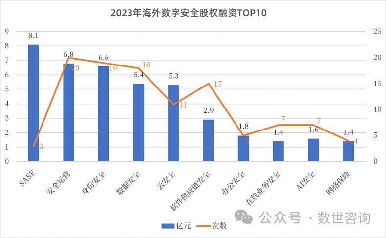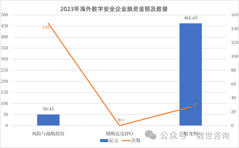 ● 2023年数字安全资本市场的股权融资再创新低,国内股权融资总额约39亿元,与2022年相比下降45%。与此同时,海外数字安全的股权融资也呈大幅度下降态势。股权融资148笔,与2022年相比下降32%。股权融资总额约为50.45亿美元,与2022年相比下降55%。