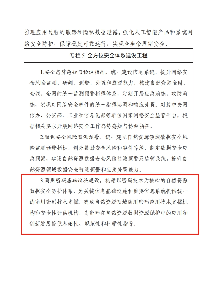 2024年2月5日,自然资源部印发《自然资源数字化治理能力提升总体方案》的通知(自然资发〔2024〕33号),要求健全密码应用保障体系,构建以密码技术为核心的自然资源数据安全防护体系,统筹国土、海洋、测绘、地调等已建商用密码平台,打造部级密码平台,利用商用密码技术和产品,为关键信息基础设施和重要信息系统提供统一的密码技术支撑。