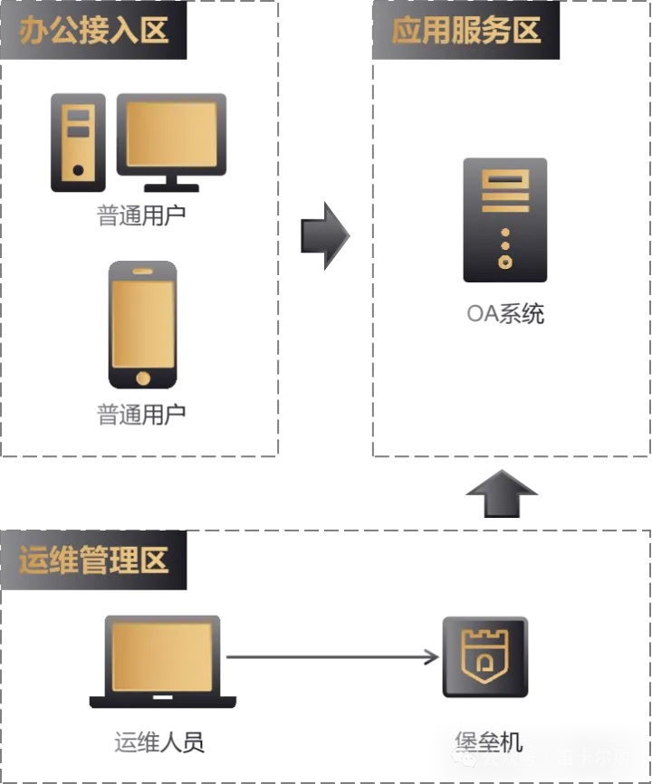 (2)运维人员从运维管理区通过堡垒机访问OA系统所在的服务器,进行设备管理。