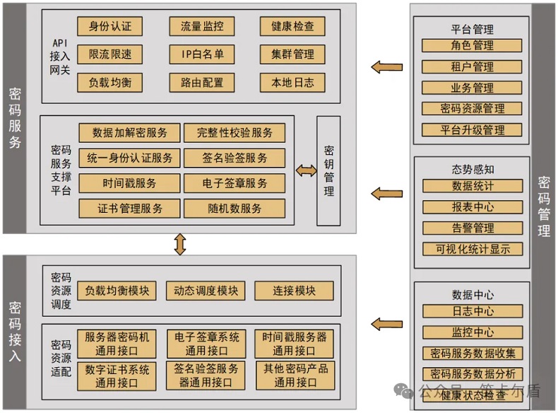 (1)密码服务:主要包含两个组成——API接入网关与密码服务支撑模块。API接入网关提供适用于主流操作系统和CPU架构的密码服务接口,提供密码应用调用标准流程,功能包括身份认证、流量监控、健康检查、限流限速、IP白名单、集群管理、负载均衡、路由配置、本地日志等;密码服务支撑模块提供各类密码服务调用支撑,包括数据加解密服务、完整性验证服务、统一身份认证服务、签名验签服务、时间戳服务、电子签章服务、证书管理服务、随机数服务等,同时密钥管理功能可对上述服务进行统一密钥分发、更新、删除等管理。通过简化调用流程,屏蔽密码复杂逻辑,提供高可靠、易复用的一整套服务接口,实现对云加解密服务、完整性服务、签名验签服务调用,对业务系统数据存储、传输的机密性和完整性保护。