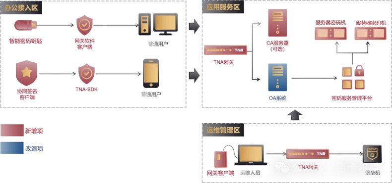 此改造方式实现了对OA系统已有堡垒机的利旧。若OA系统已有堡垒机不支持多因素认证,或系统中无已部署堡垒机时,为缓解密码应用安全性评估中的高风险项,可考虑通过部署国密堡垒机的方式完成改造。