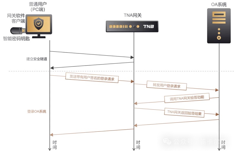 (2)用户通过智能密码钥匙+网关软件客户端向OA系统发送登录请求,其中登录请求带有用户的签名;TNA网关将用户请求转发给OA系统,OA系统调用TNA网关的验签功能对带有用户签名的登录请求进行验签,验证通过则用户登录成功。