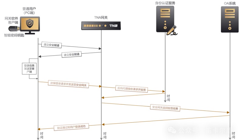 (1)PC端用户在办公接入区通过智能密码钥匙+网关软件客户端与TNA网关建立安全隧道。