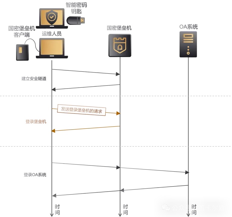 运维人员登录国密堡垒机再访问OA系统的流程为: