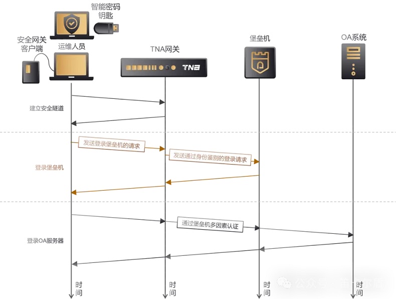 运维人员通过TNA网关登录普通堡垒机再访问OA系统的流程为: