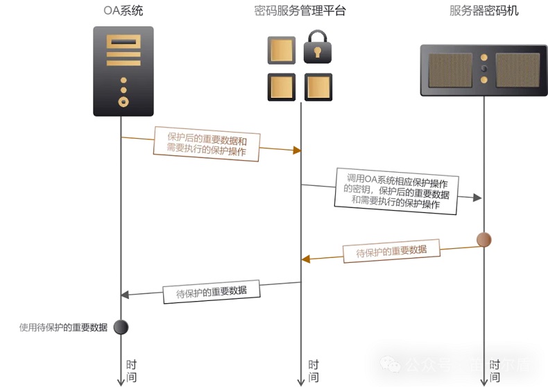(2)密码服务管理平台读取OA系统请求后,调用OA系统相应保护操作的密钥,以及待保护的重要数据和需要执行的保护操作,发送给服务器密码机。