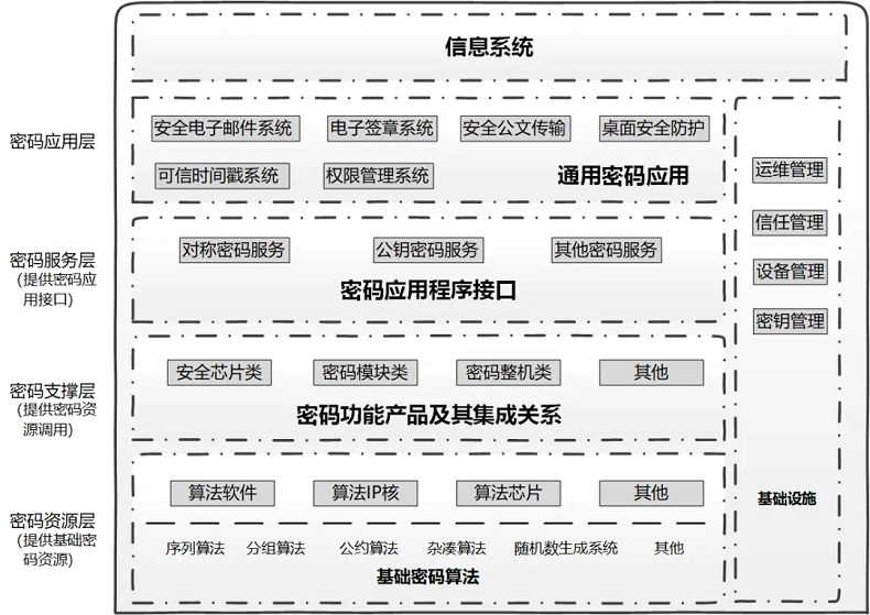 密码支撑层:提供密码资源调用,由安全芯片类、密码模块类、密码整机类等各类商用密码产品组成。