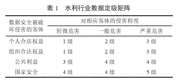 按照数据一旦遭到篡改、破坏、泄露或者非法获取及利用,对国家安全、公共利益、组织或个人合法权益造成的影响和危害程度,将数据从低到高分成1~5个级别,对应一般数据(1~3级)、重要数据(4级)、核心数据(5级)。水利行业数据定级矩阵如表1所示。