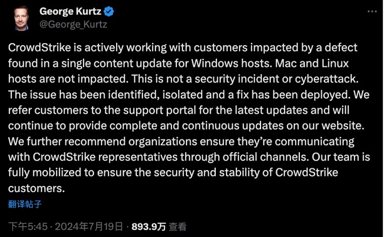George Kurtz强调说“这不是安全事件或网络攻击,我们已经发现并且隔离了这个bug,还部署了修复程序”。
