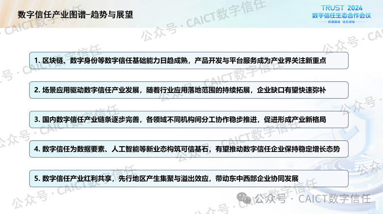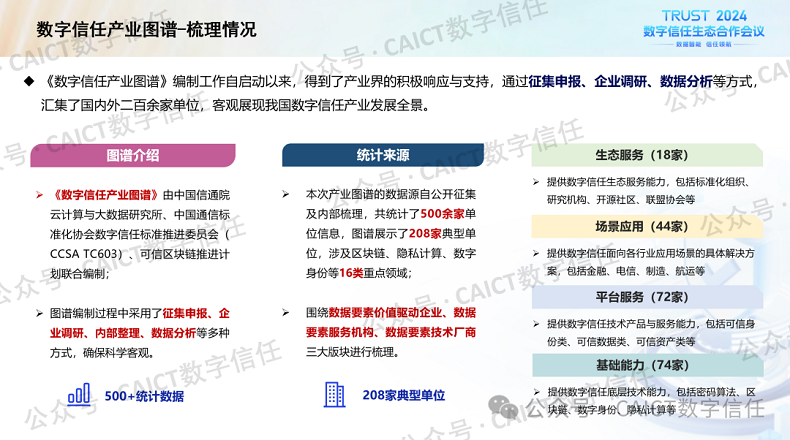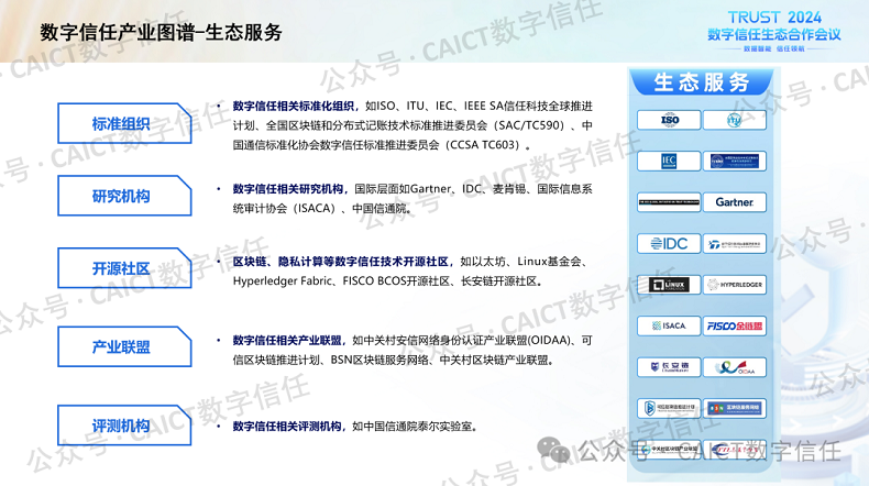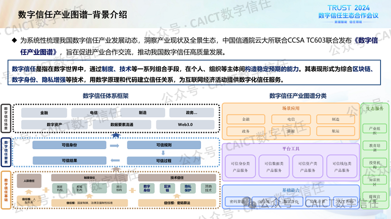 为系统性梳理我国数字信任产业发展动态,洞察产业现状及全景生态,促进产业合作交流,推动我国数字经济高质量发展,2024年8月20日,由中国信息通信研究院、中国通信标准化协会主办,可信区块链推进计划(TBI)、中国通信标准化协会数字信任技术标准推进委员会(CCSA TC603)、中国通信标准化协会大数据技术标准推进委员会(CCSA TC601)、 IEEE SA信任科技全球推进计划、中国互联网协会区块链技术应用工作委员会承办,上海市徐汇区数据局协办的2024数字信任生态合作会议在北京圆满召开。