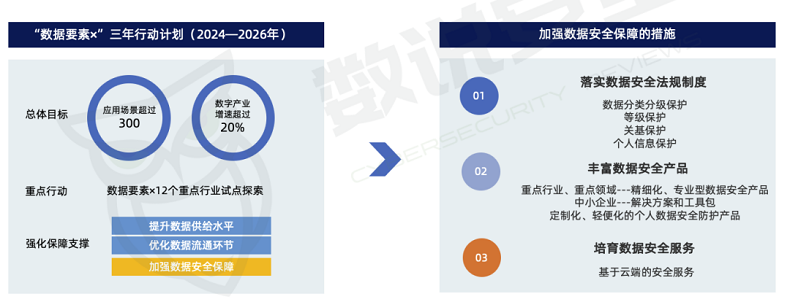 政策层面正持续推进数字经济与数据安全的整体规划与实施,致力于构建数字安全屏障和加强数字技术创新体系的能力。2024年,十七部门联合发布了《“数据要素×”三年行动计划(2024—2026年)》,该计划着重强调了增强数据供给的质量和效率、优化数据流通环境、以及加强数据安全保护的重要性。具体而言,计划中提出了明确的要求和措施,旨在深化对数据要素价值的认识,并通过实际行动促进数据资源的有效利用与安全防护,进而支持数字经济和数字社会的全面进步。这些细化的实施策略将有助于更高效地实现《数字中国建设整体布局规划》设定的目标,推动数字中国建设向更深层次发展。