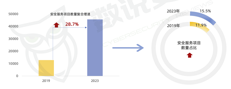 根据数说安全商业分析平台可以看到,2019年-2023年国内安全服务项目数量复合增速为28.7%,2023年安全服务项目数量已经超过4万个。安全服务项目数量占比从2019年11.9%提升至15.5%。