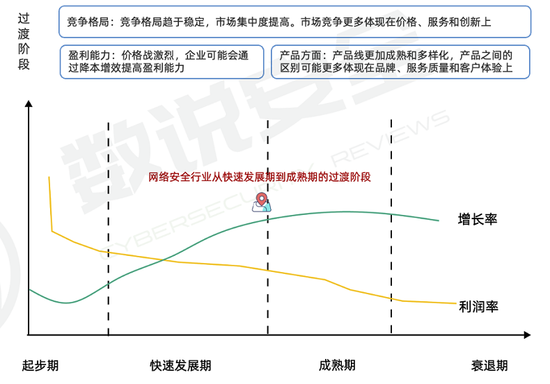 目前,但从竞争格局、盈利能力、产品等维度来看网络安全行业正处在成长期和成熟期之间的过渡阶段,过渡阶段对网络安全厂商来说,既是挑战也是机遇。