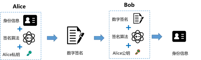 现有公私钥体系的签名/验签过程常常用来进行身份认证。如下图所示。Bob使用Alice的公钥实现对Alice签名后的信息进行验签。