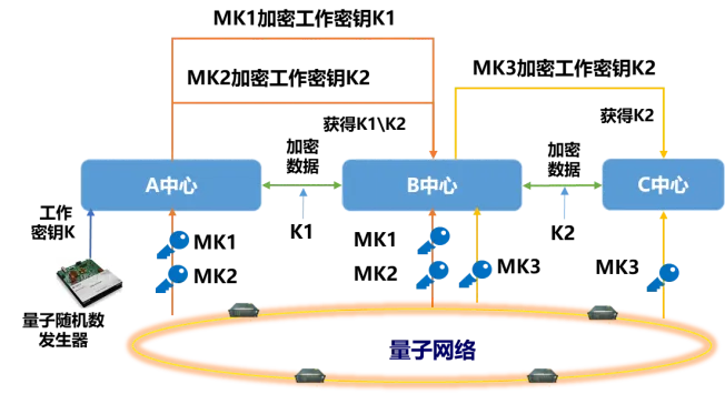 量子网络分发的成对密钥作为通信主密钥(MK),工作密钥(K1)在用通信主密钥加密后同步到其他节点。