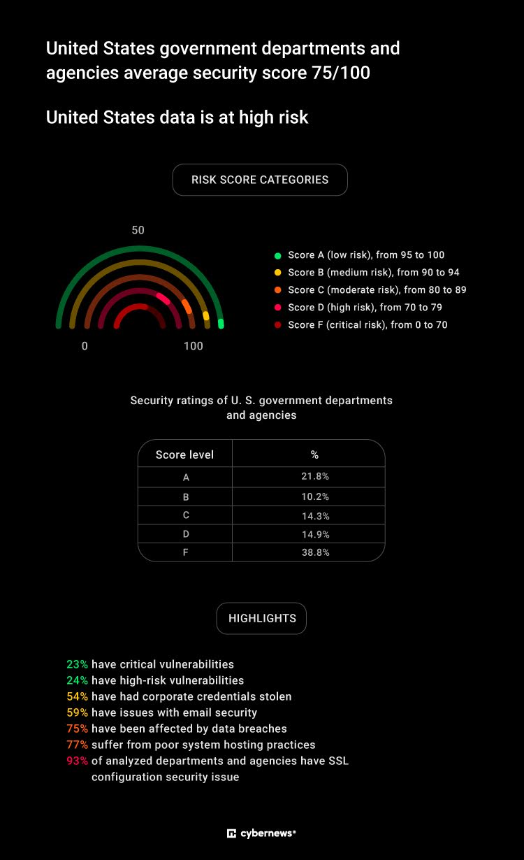 Cybernews 研究团队对 490 个美国政府部门和机构的域名进行评估分析。结果显示,93% 的机构存在 SSL/TLS 配置问题,导致敏感数据面临中间人攻击风险;75% 的机构因数据泄露导致企业凭证被盗,27% 的员工重复使用已被攻击的密码;仅有 22% 的部门获得网络安全 A 级评分,超半数机构评分低于 D 级。
