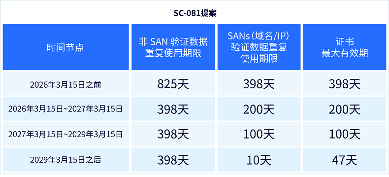 •SANs(域名/IP)验证数据的重复使用期限将从 398 天逐步缩短为200天、100天,最终在2029年3月起缩短至 10 天。
