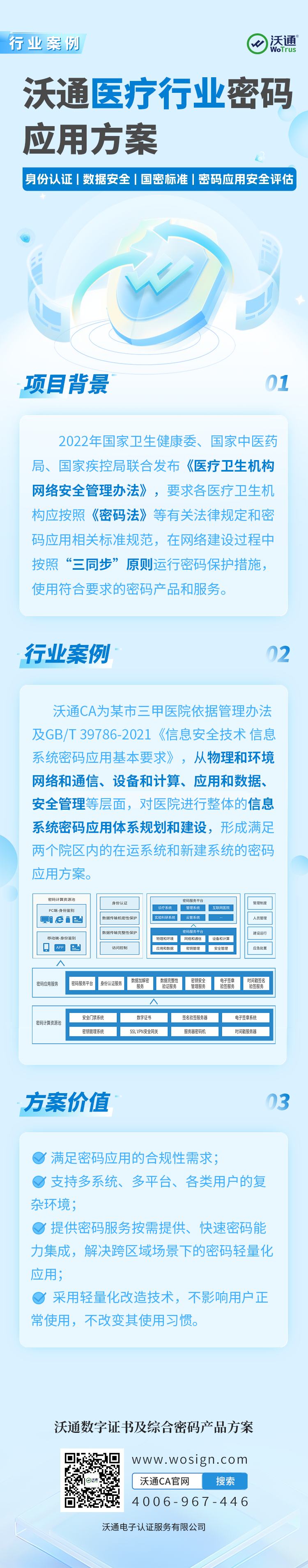 沃通CA依托密码技术形成涵盖数字证书、身份可信认证、电子签名/签章、数据加密保护等的商密产品服务,结合医疗行业应用经验,为医疗行业多业务、多场景应用需求,提供更全面深入的解决方案。