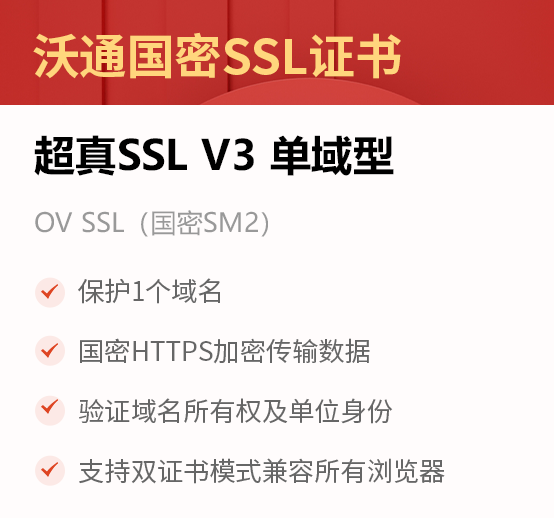 沃通SSL证书双节钜惠活动期间,精选超真SSL V1单域型、超真SSL V3通配型等沃通国密SSL证书产品,纯国产、国密合规,支持SM2/SM3/SM4国产密码算法和国密安全协议,兼容主流国密浏览器,采用自主可控密码技术保护数据机密性、完整性,防止数据在传输过程中被窃取或篡改,实现国密HTTPS加密通信以及服务器身份认证。