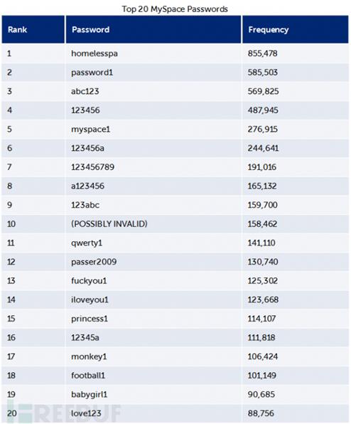 According to the data, the most commonly used passwords of MySpace account are as follow: