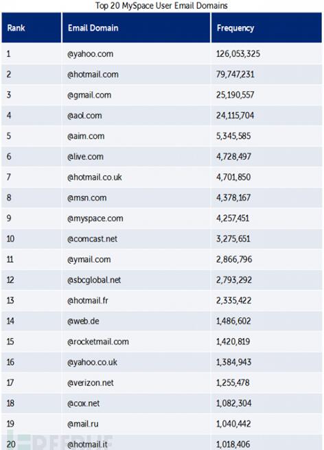 The most commonly used email domains of MySpace are as follow: