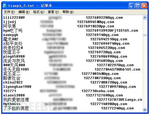In the end of 2011, 40 million users’ information of Tianya has been leaked. Accounts, passwords and email addresses are all saved in clear texted and spread on the internet. The information was preliminary confirmed as validated.