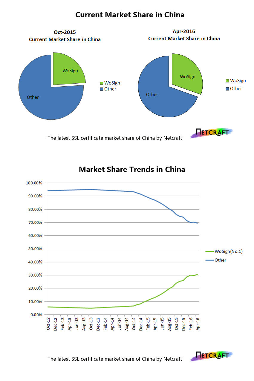 According to the Netcraft report, the rapid growth of WoSign (www.wosign.com ) in Chinese SSL certificate market makes it come to the first place in market share within a year, catching up with and surpassing many foreign enterprises. WoSign has become the Chinese brand with the strongest competitive power in the field of SSL certificate.Chinese SSL certificate market is based on SSL sites which are hosted in China.