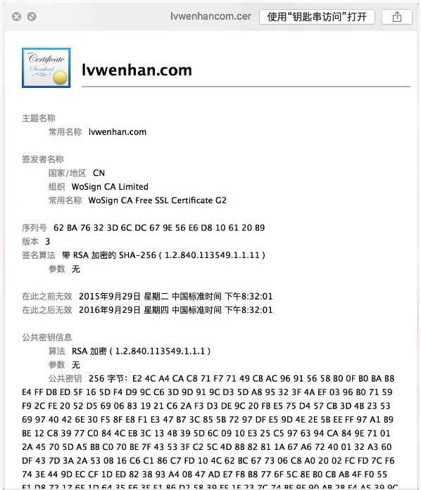 下面两张图分别是我的个人博客的一张旧证书的 cer 和 crt 两种格式,在 Finder 中点击空格预览的结果: