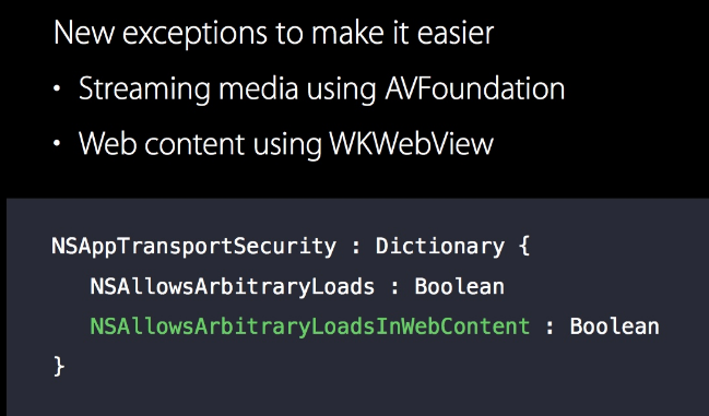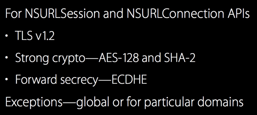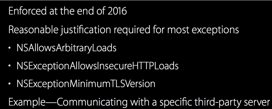 发布日期:2017-01-06苹果在 WWDC 2016 上宣布:2016 年底将要求所有 APP 适配苹果的 App Transport Security,简单地说就是除了特殊情况(浏览器、第叁方服务、媒体)外,APP 跟服务端的通信必须使用 HTTPS 协议,否则 iOS 9 和 macOS 10.11 起,操作系统将有能力阻止所有的明文 HTTP 请求。在上面的 session 中,苹果还对具体的细节做出了要求。不过,前日,苹果宣布将这个 deadline 无限期推迟。