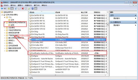 进入到MMC计算机用户中后,在受信任的根证书颁发机构里面找到如图所示的证书,邮件剪切到“不信任的证书”(只有一个就剪切一个)