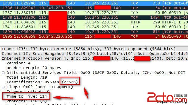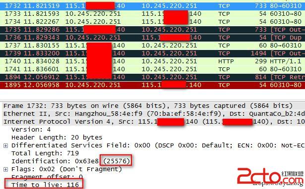 通过分析抓取的样本数据发现,数据包在传输过程中出现异常TTL,目标机的正常TTL为51如图2。