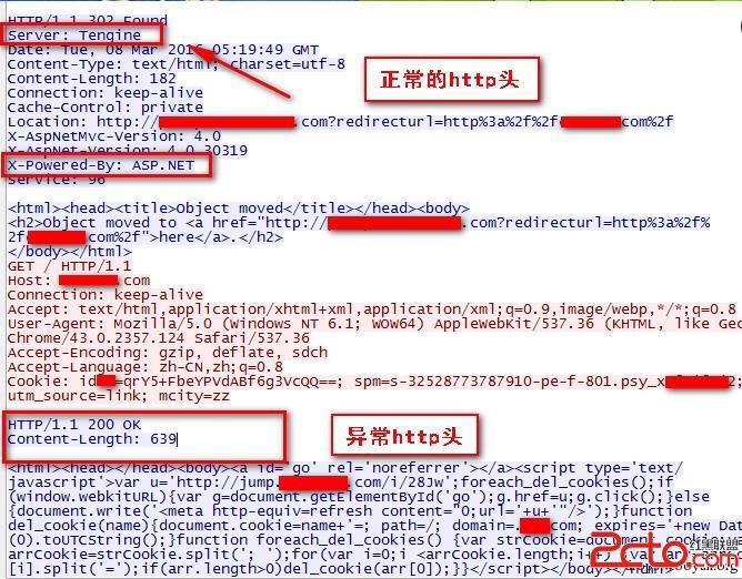 有用户反馈访问公司部分业务的URL时被重定向至公司其他业务的URL,导致用户无法请求所需的服务,严重影响了用户体验以及用户利益。我们第一时间通过远控的方式复现了上述现象,并及时抓取了相关数据包以供分析,当然前期也采取了用户电脑杀毒、开发者工具分析等方式排除了用户端个人原因的可能性。从图1来看,初步判断是运营商某员工所为,意欲通过流量重定向来获取非法的流量分成,啥意思呢,被劫持的该业务的流量要经过联盟的该账户spm,使得公司再付费给联盟,归根结底还是为了盈利。