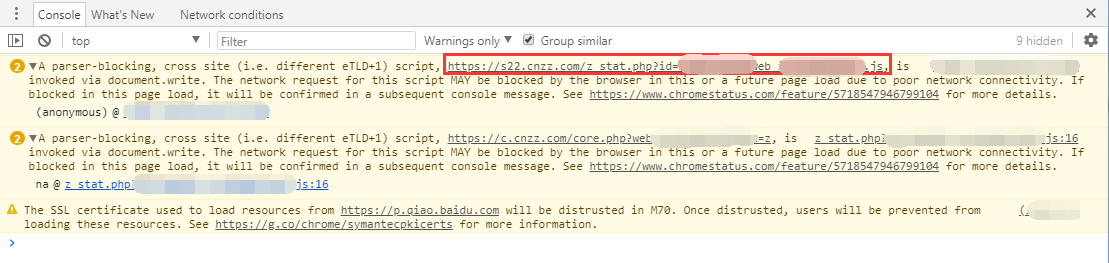 发布日期:2018-06-08很多站长会遇到一个问题,网站加入CNZZ的JS统计代码后,Chrome浏览器出现警告:阻止跨站解析器阻断脚本通过document.write调用(A parser-blocking, cross site script,XXXX.js is invoked via document.write.)。该警告有时候可能会使HTTPS页面出现不安全因素,甚至让使用EV SSL证书的网站出现不显示绿色地址栏等问题。本文将带您找出错误原因,解决Chrome对CNZZ统计代码报错的问题。