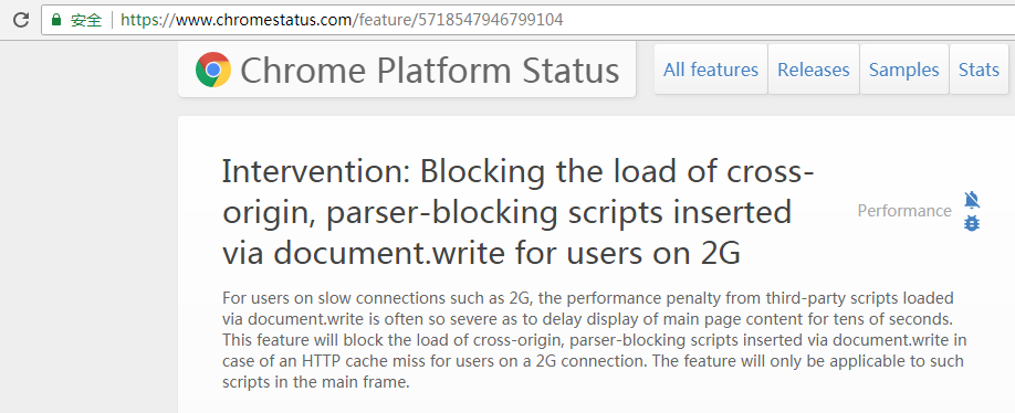 根据Chromestatus的表述,对于诸如2G之类的连接速度较慢的用户来说,通过document.write加载的第三方脚本,性能损失通常非常严重,以至于主页内容的显示会延迟数十秒。