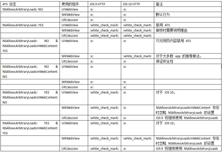 另外,当 NSAllowsArbitraryLoads 和NSAllowsArbitraryLoadsInWebContent 同时存在时,根据系统不同,表现的行为也会不一样。简单说,iOS 9 只看 NSAllowsArbitraryLoads ,而 iOS 10 会先看NSAllowsArbitraryLoadsInWebContent 。在 iOS 10 中,要是NSAllowsArbitraryLoadsInWebContent 存在的话,就忽略掉NSAllowsArbitraryLoads ,如果它不存在,则遵循 NSAllowsArbitraryLoads的设定。说起来可能有点复杂,我在这里总结了一下根据NSAppTransportSecurity 中设定条件不同,所对应的系统版本和请求组件的行为的不同,可以作为你设置这个字典时的参考。