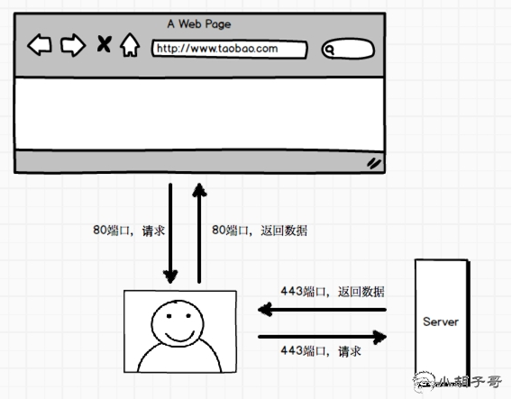 起因是这样,https 使用的是 443 端口进行数据传输,而浏览器的默认端口是 80. 劫持者首先劫持用户的 80 端口,当用户向目标页发起请求时,劫持者模拟正常的 https 请求向源服务器获取数据,然后通过 80 端口返回给用户,大概可以看下下面两张图: