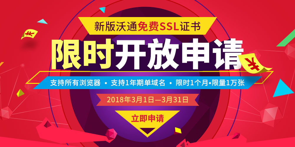 活动内容:面向沃通用户开放免费SSL证书申请权限,限时1个月、限量1万张,先到先得!