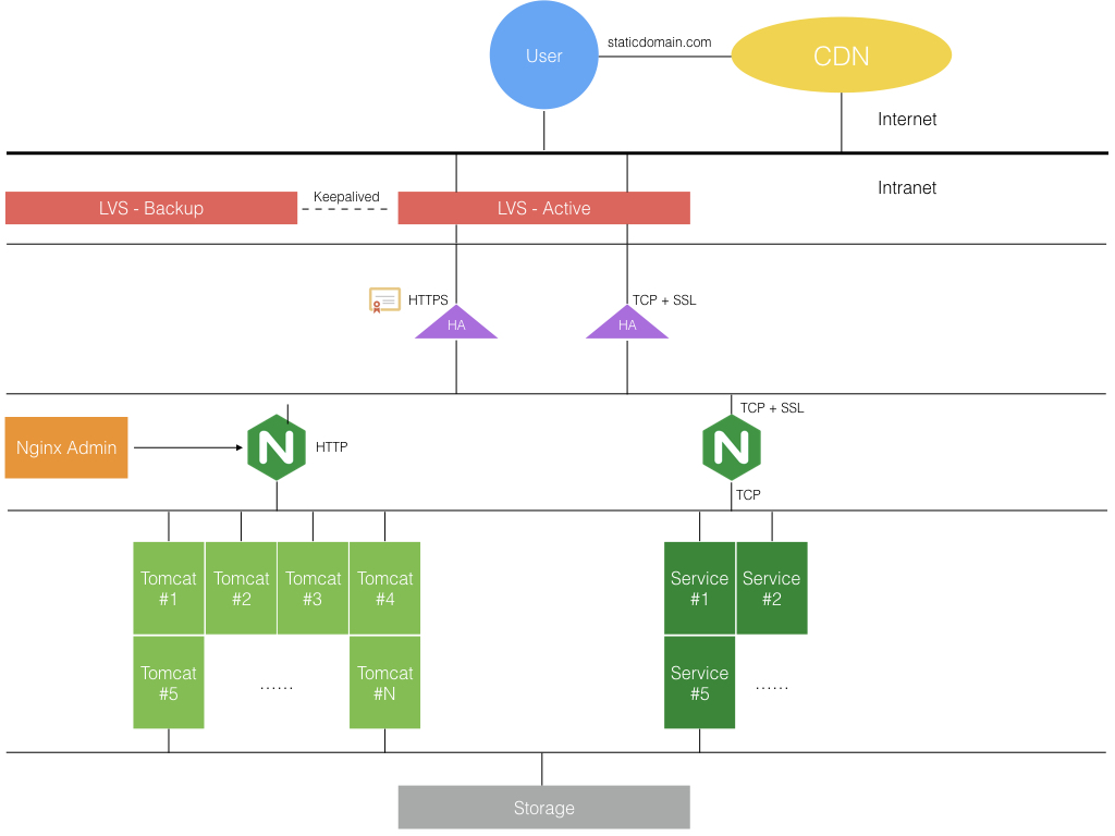 讲完SSL/TLS 的基本原理和交互流程,就以我所在的IM 项目为例,这里同时涉及 HTTP + S 和 TCP + S。HTTP 属于全公司一起加S,那就加在统一的负载均衡层,也就是HAProxy 那里,对整体应用无影响(参见下面部署结构图)。而IM 客户端应用也可以间接通过HTTPS 前置请求获得对服务端的认证,然后选择接入服务器建立TCP 长连接。TCP 长连接实际只需要做加密保护,不再需要二次认证。