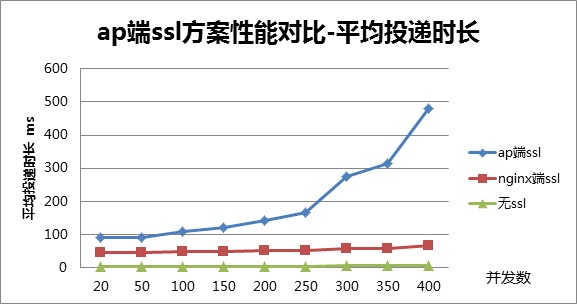一开始,我们是在自己的接入应用中,基于JDK 的SSL 库实现的TCP + S,但是发现在高并发压力下发现性能衰退的厉害,后来便改成了使用Nginx 前置接入的方式。对比性能测试如下所示: