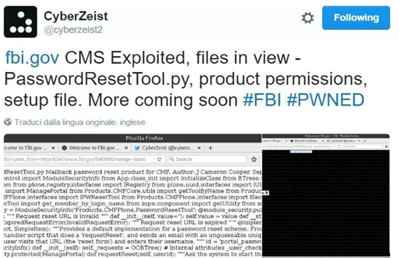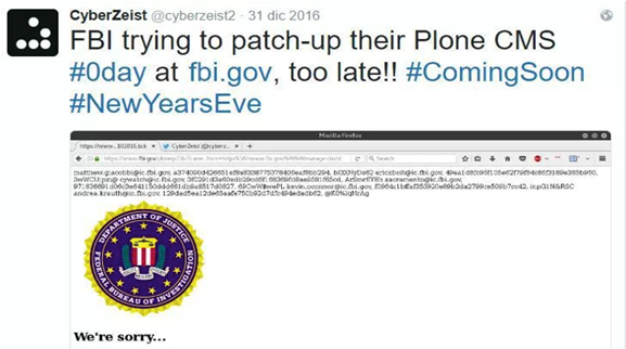 CyberZeist在其推特上发表推文称:“在2016年12月22日,我成功利用了一个Plone CMS(Plone内容管理系统)中的漏洞,并通过这个漏洞成功入侵了美国联邦调查局的官方网站FBI.gov。Plone CMS被认为是目前世界上安全性最高的内容管理系统,包括美国联邦调查局在内的很多政府高级机构都在使用这款内容管理系统。”