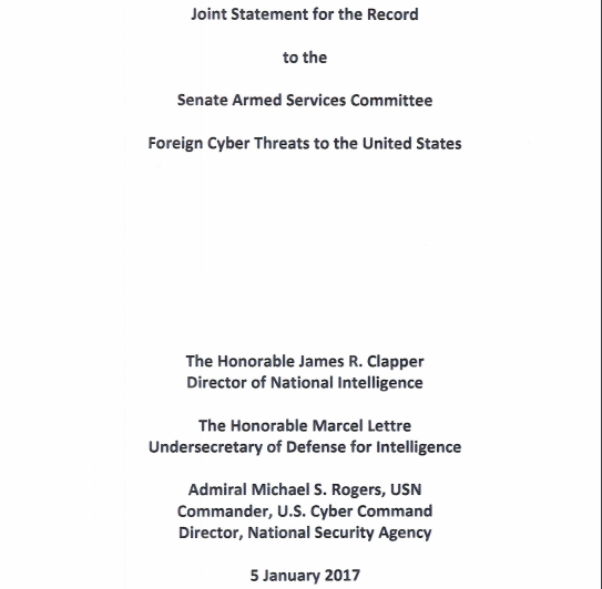 发布日期:2017-01-16美国华盛顿当时时间2017年1月5日,美国参议院军事委员会举行的“外国针对美国的网络威胁”听证会上,美国国家情报总监詹姆斯·克拉珀(James Clapper)、国安局局长迈克尔·罗杰斯(Michael Roger)上将和的国防部负责情报的副部长马塞尔·莱特(Marcel Lettre)出席作证。詹姆斯·克拉珀向参议员表示,美国情报机构没有办法衡量俄罗斯入侵对选举结果的影响。