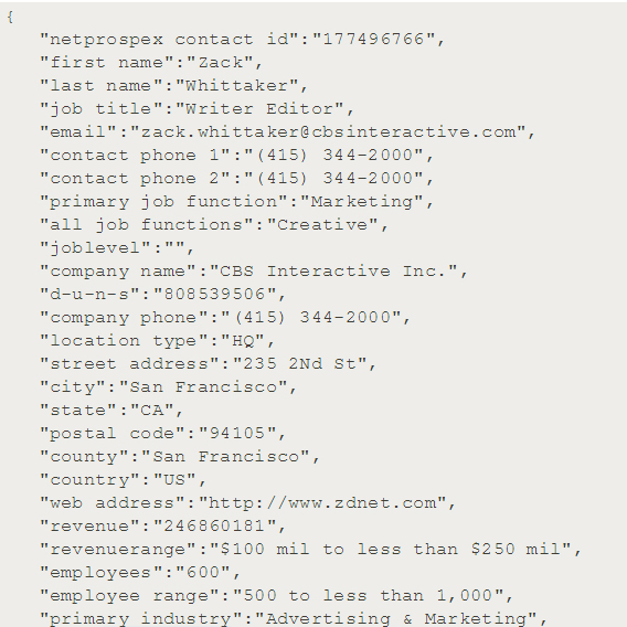商业服务巨头Dun & Bradstreet证实是该数据库拥有者,并透露这是2015年一笔1.25亿美元的交易收购NetProspex公司所获得。这套数据库包含九十条字段,其中一部分包含多项个人信息,例如姓名、职称与职能、工作电子邮箱地址以及电话号码。其它信息还包括公开的更为通用的企业数据,包括准确的办公地点、业务单位内员工人数以及与企业所属行业相关的其它描述,例如广告、法律、媒体与广播以及电信等信息。整套数据库旨在帮助Dun & Bradstreet公司定位其电子邮件营销活动,并通过其它通信途径引导其营销人员拓展现有及潜在客户群体。